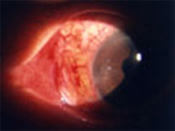 球結膜下組織が三角形状に隆起し瞼裂部から角膜に侵入した状態です。